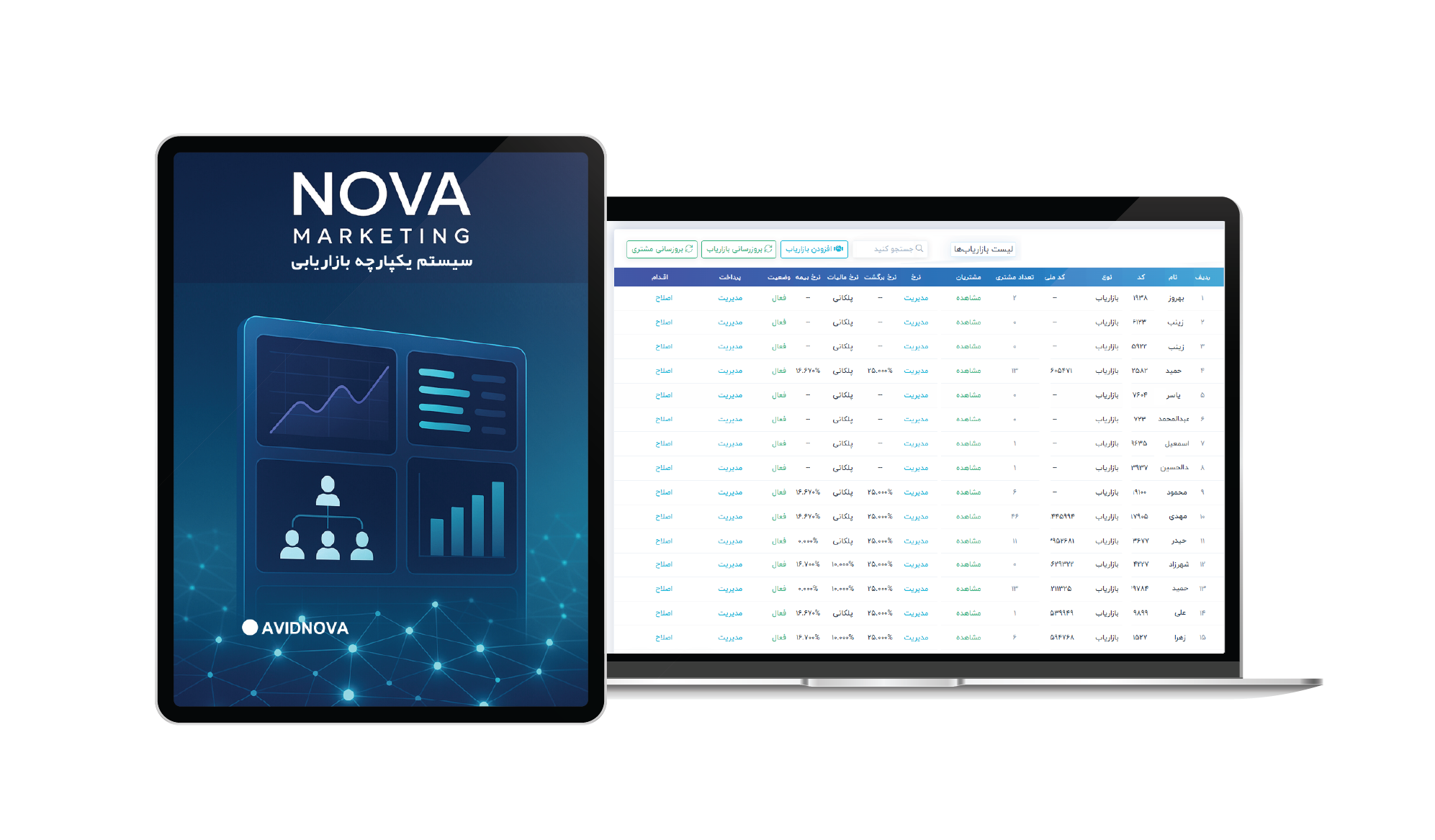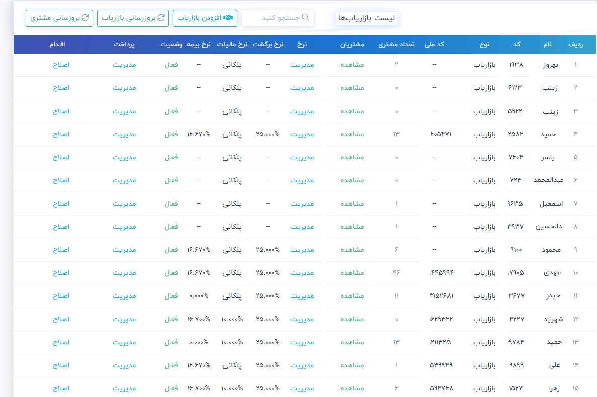 نقطه کنترل همهچیز: اطلاعات بازاریابها، وضعیتها (فعال/غیرفعال/در انتظار)، زیرمجموعهها، نرخها، اسناد پرداخت، آرشیو و تقویم مالی همه یکجا، با جستوجو و فیلتر حرفهای.