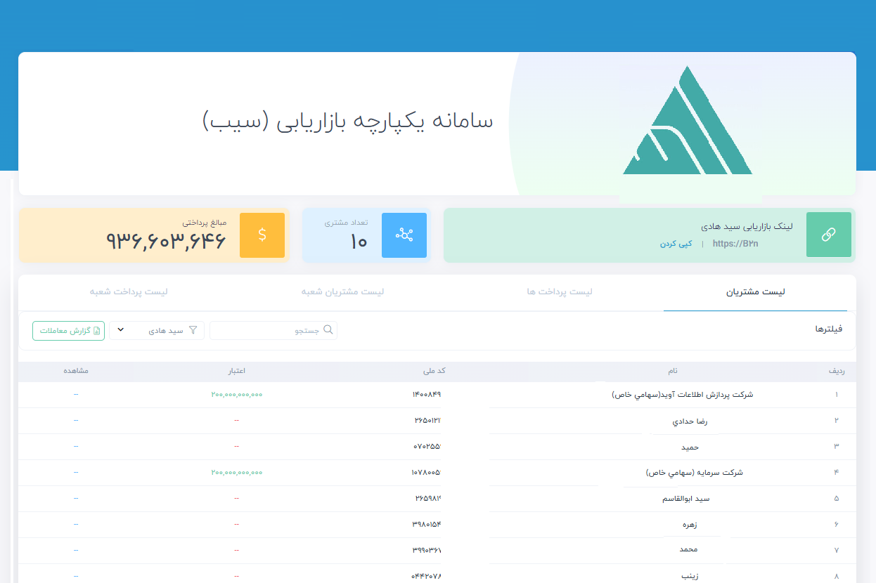 سامانه مدیریت بازاریابی شعب و بازاریاب ها با توجه به نیاز شرکت های کارگزاری فعال در بازار سرمایه در جهت مدیریت و تسهیل امور محاسبات پیچیده و زمانبر هزینه های بازاریابی کارگزاری ها طراحی شده است. از اهداف این سامانه، مدیریت و انجام امور بازاریابی کارگزاری ها در ابعاد بسیار بالا می باشد. از خصوصیات منحصر به فرد این سامانه امکان انطباق سامانه باشگاه مشتریان کارگزاری با سیستم پیشرفته بازاریابی میباشد که قابلیت تنظیم محاسبات با توجه به استراتژی کارگزار را دارد.